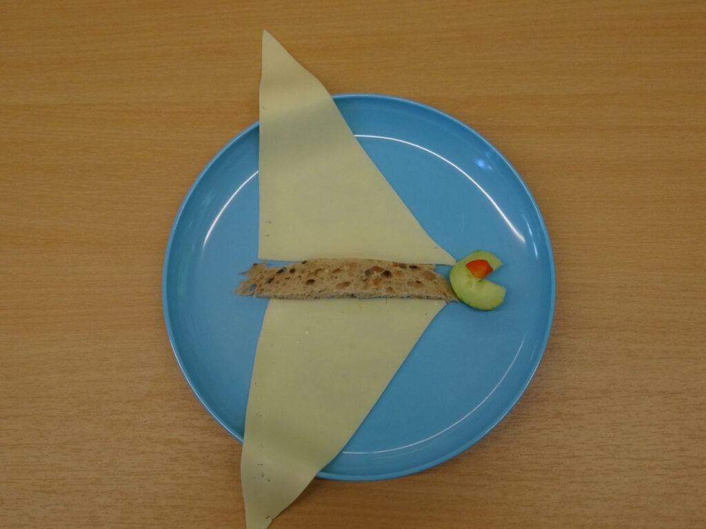 Zubereitung: Mit Deiner Hilfe schneiden die Kinder einen schmalen Streifen Brot ab, welchen sie als Körper verwenden und mittig auf ihren Teller legen. Eine Gurkenscheibe wird als Kopf verwendet. Schneide zusätzlich ein kleines Dreieck aus der Gurkenscheibe heraus, so erhält der Flugsaurier einen Mund.